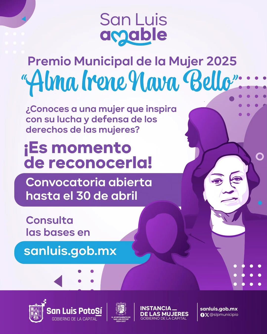 El Ayuntamiento de San Luis Potosí por primera vez condecorará a mujeres y organizaciones civiles potosinas que se han se han distinguido por su labor en la protección de los derechos humanos, otorgando el premio “Alma Irene Nava Bello”, informó la Directora de la Instancia Municipal de las Mujeres, Martha Orta Rodríguez, para agregar que está abierta la convocatoria para el registro de las candidatas.