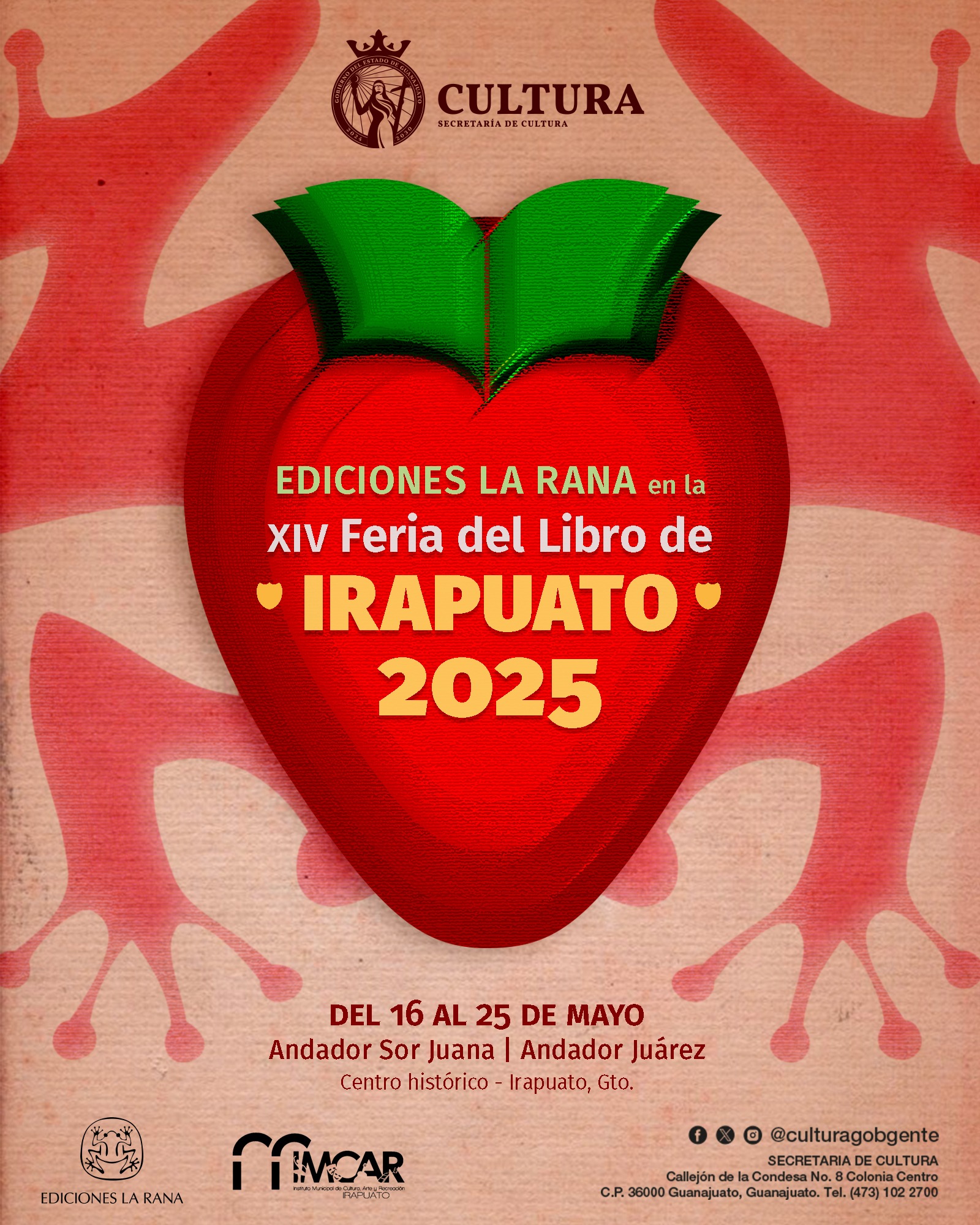 La Secretaría de Cultura del Estado de Guanajuato, a través de Ediciones La Rana, participará en la décima cuarta edición de la Feria del Libro de Irapuato, que se llevará a cabo del 16 al 25 de mayo en el corazón de la ciudad, en el andador Juárez y Sor Juana Inés de la Cruz.