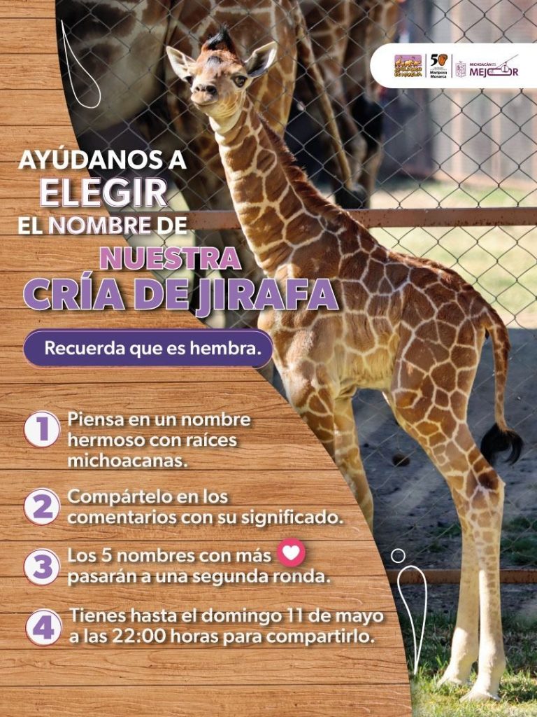 El Zoológico de Morelia ha lanzado la convocatoria para participar en la dinámica para nombrar a la jirafa hembra que nació el pasado 25 de marzo.