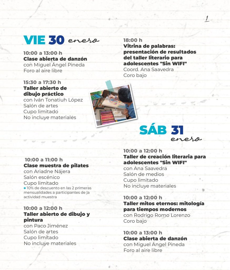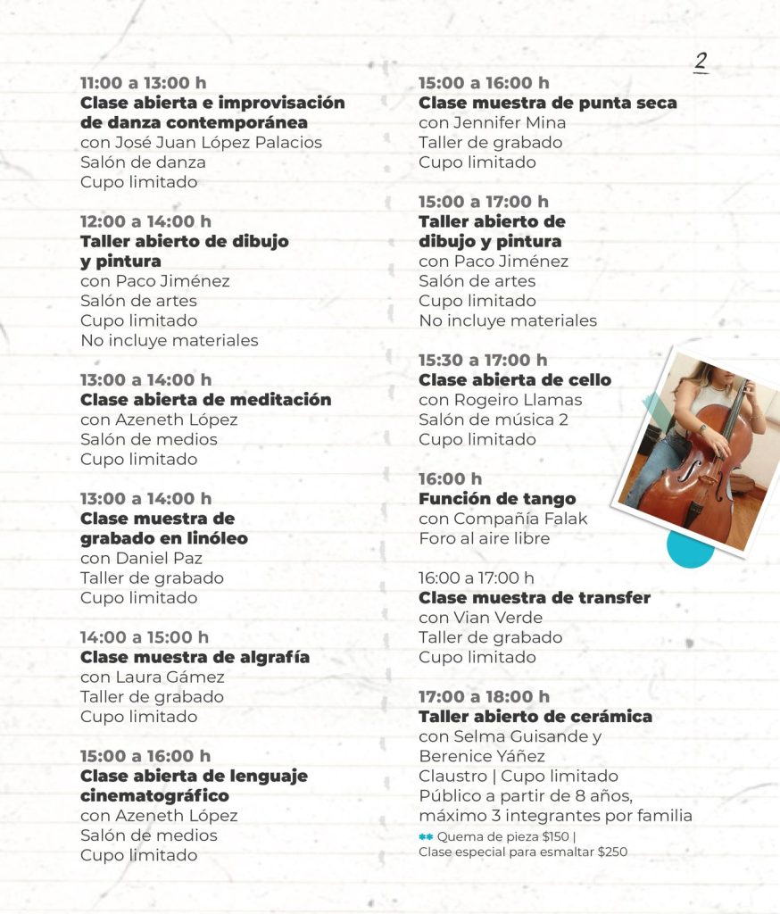 El evento contará con un extenso programa que incluye clases de pintura, pilates, danzón, dibujo, danza contenporánea, punta seca, meditación, cello, yoga, salsa cubana, grabado en linóleo, cerámica, transfer, algrafía y lenguaje cinematográfico, así como talleres de cerámica, pintura, creación literaria y mitología, y funciones de sombras, bellydance tribal y tango.