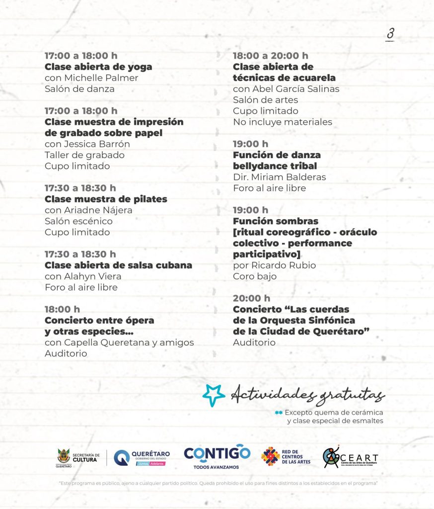 Todos los eventos se llevarán a cabo en el CEART, que se ubica en el número 89 de la calle José María Arteaga, en el centro Histórico de la capital queretana.