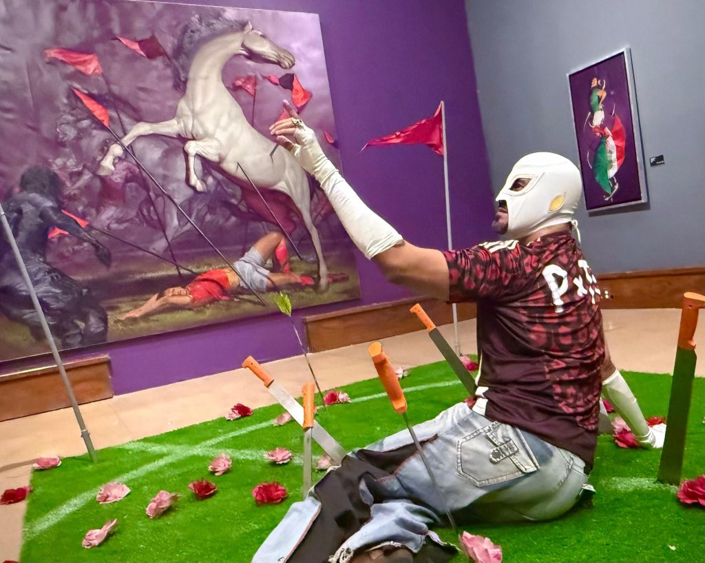 De esta manera, la exhibición muestra la trayectoria del artista en tres periodos importantes: por un lado, la exploración plástica del retrato desde la erotización del cuerpo homosexual afeminado; por el otro, la elaboración de narrativas pictóricas en torno al cuerpo racializado a partir de la iconografía de las mariconas morenas y la iconoclasia de personajes del mundo androcéntrico.