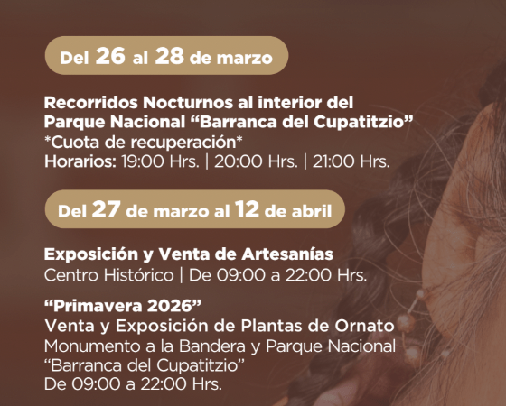 El programa incluye una amplia variedad de actividades, desde experiencias naturales, como Recorridos Nocturnos al interior del Parque Nacional “Barranca del Cupatitzio” que podrán disfrutarse del 26 al 28 de marzo; y la venta y Exposición de Plantas de Ornato que tendrá lugar del 27 de marzo al 11 de abril en el Monumento a la Bandera y en el Parque Nacional “Barranca del Cupatitzio» de 9 a 22 horas.