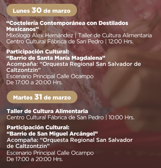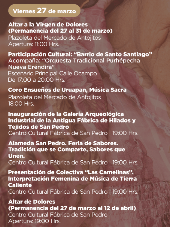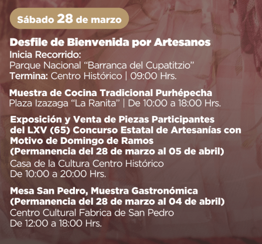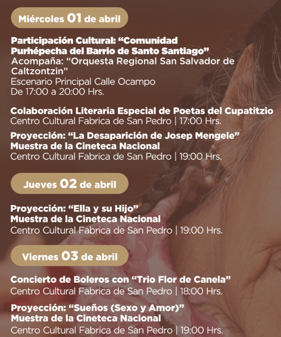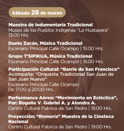 En el ámbito cultural el 27 de marzo se inaugurará la Galería Arqueológica Industrial de la Antigua Fábrica de Hilados y Tejidos de San Pedro en el Centro Cultural Fábrica de San Pedro, y el 28 de marzo se desarrollará la Muestra de Cocina Tradicional Purhépecha en la Plaza Izazaga “La Ranita”.