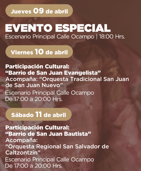 Como parte de las tradiciones religiosas, del 27 al 31 de marzo se colocará el Altar a la Virgen de Dolores en la Plazoleta del Mercado de Antojitos; y el 4 de abril se llevará a cabo la Tradicional Quema de Judas en el Barrio de la Santísima.